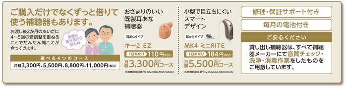月額税込3,300円~ 定額にて補聴器を貸し出しいたします。使えるようになるか不安な方は、まずは補聴器を借りることから始めてみませんか?