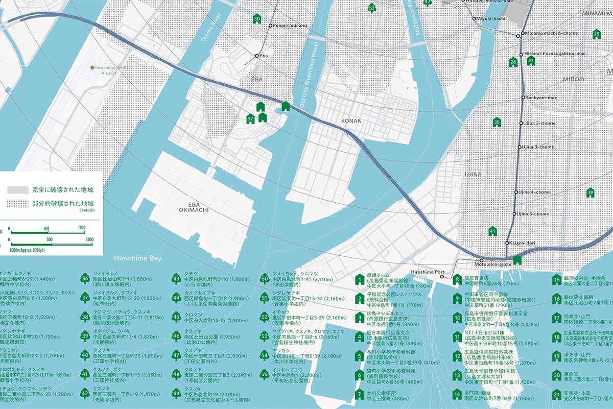 現存する被爆遺産(被爆樹木、被爆建物、被爆橋梁)をすべて記しています。また、街が復興していった過程と、平和都市として世界に発信する活動の一部を記載しています。