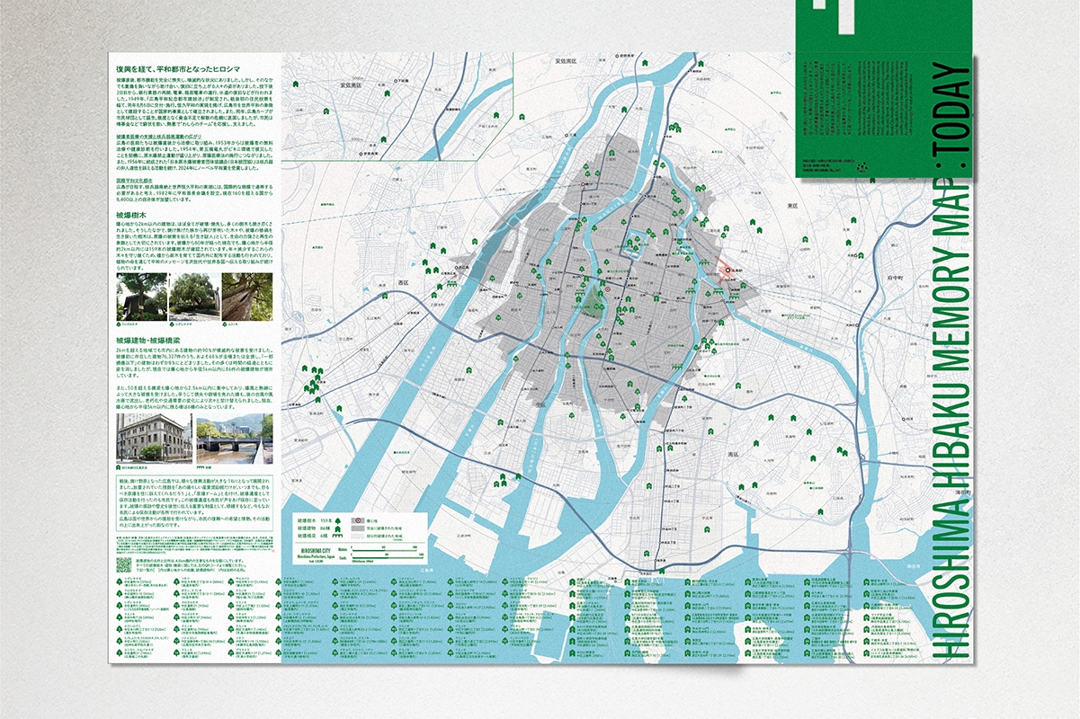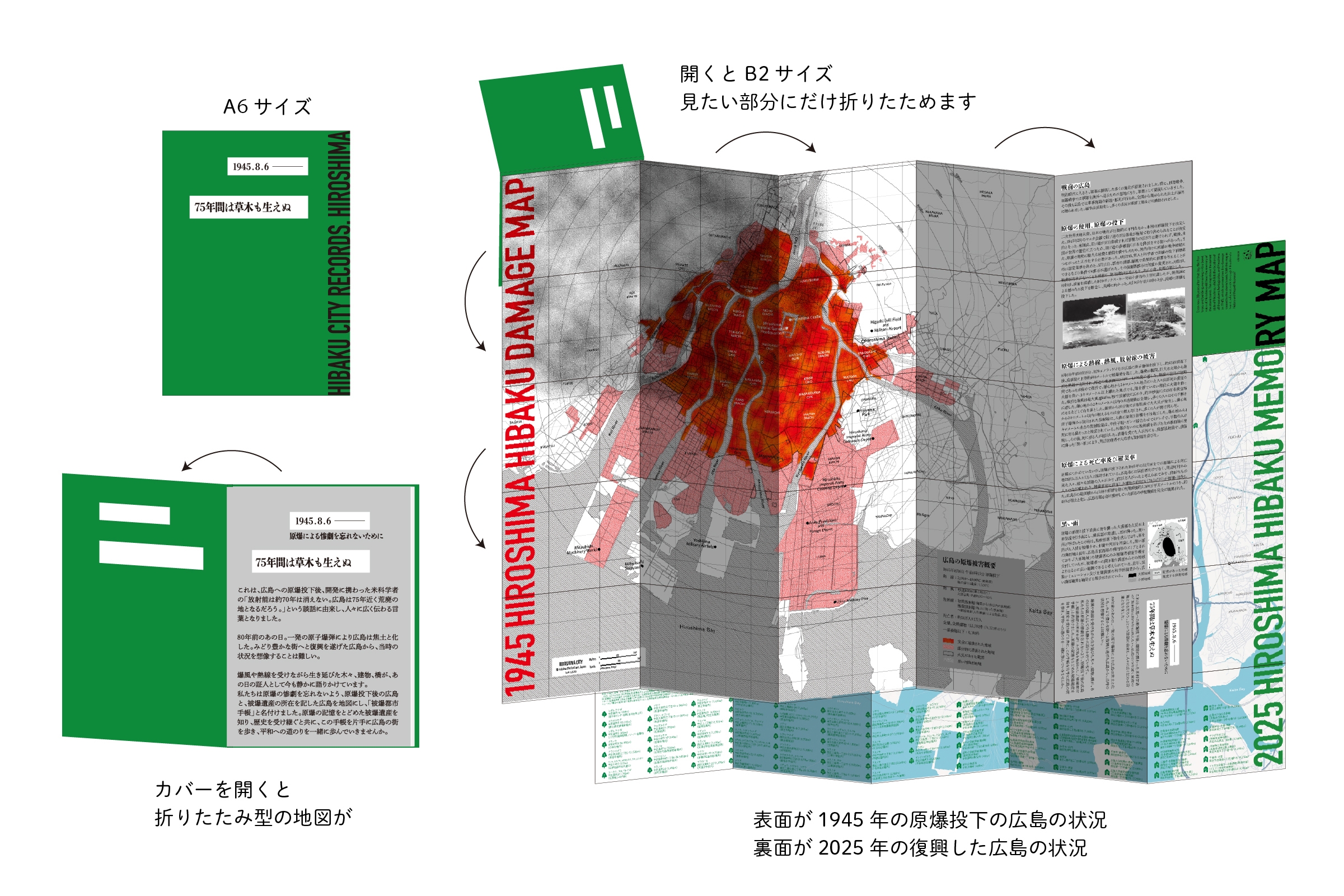 被爆の実相を伝える被爆遺産をマッピングした2025年の広島と、原爆投下後の被害状況を記した1945年の広島を地図の表裏に配しており、あの日と今の広島を体感できる仕組みになってます