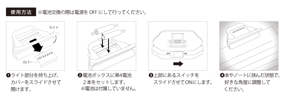 昼光色と温白色の2種のLEDライトで目にやさしい5,000ケルビン相当の明るさを表現し、文字を読むのに最適な明るさです。LEDライトは連続約30時間使用が可能(単4アルカリ乾電池2本使用)。