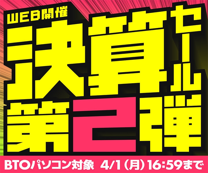 パソコン工房・グッドウィルを運営する株式会社ユニットコム(代表取締役:端田 泰三、本社:大阪市浪速区)は、パソコン工房WEBサイトにて、『決算SALE 第2弾』を2024年4月1日(月)16時59分までの期間限定で開催中です。