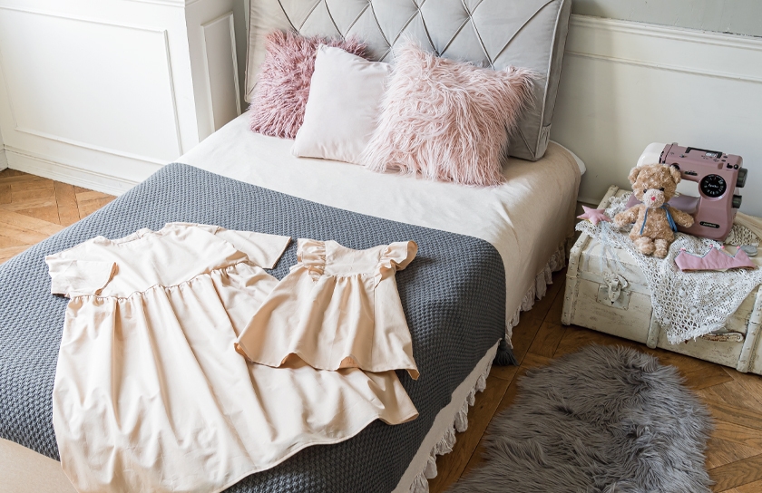 インテリアになじむどこかレトロなデザインを「ダスティピンク」と「ブルーグレー」のかわいいくすみカラーで仕上げました。