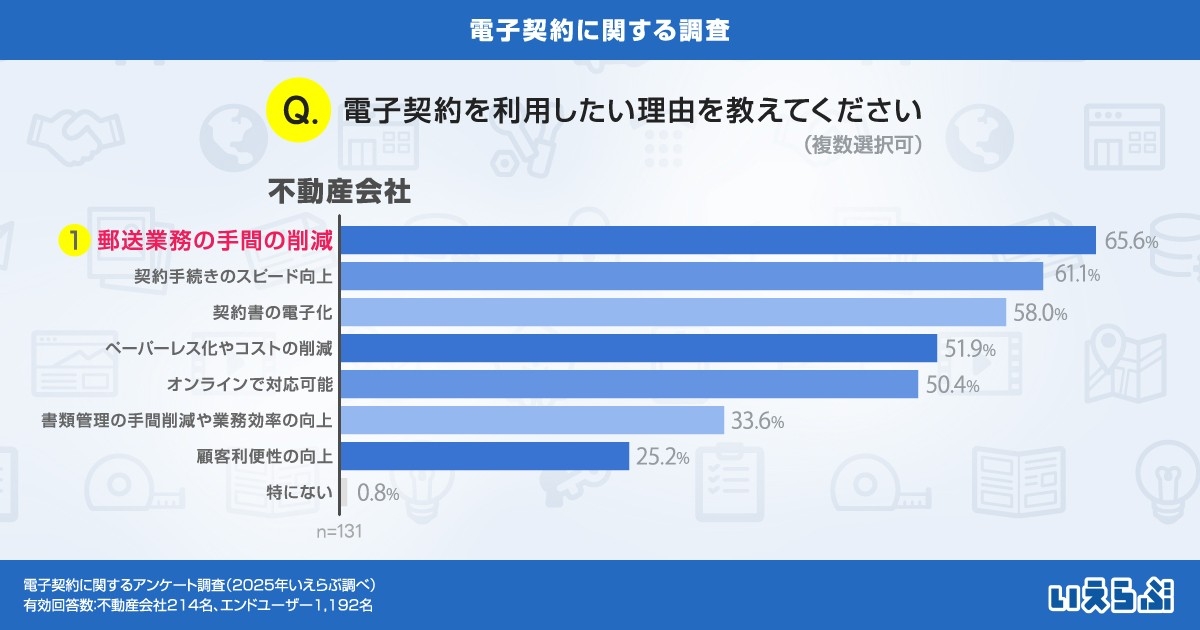 電子契約を「利用したい」と回答した不動産会社(※5)に対し、利用したい理由を尋ねたところ、最も多かったのは「郵送業務の手間を削減したい」(65.5%)、次いで「契約業務のスピードを向上させたい」(61.1%)、「契約書を電子化したい」(58.0%)という結果となりました。