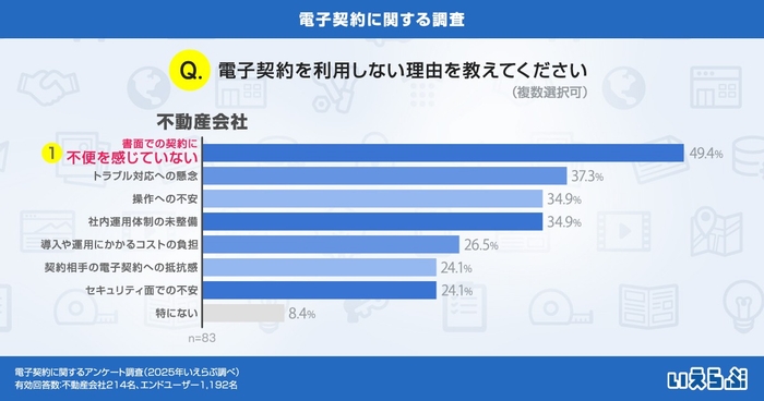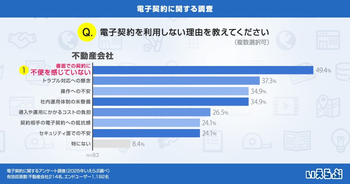 一方で、電子契約を「利用する予定はない」と回答した不動産会社(※6)に理由を尋ねると、「書面での契約に特に不便を感じていない」(49.4%)が最も多く、次に「トラブル対応に対する懸念」(37.3%)が続きました。