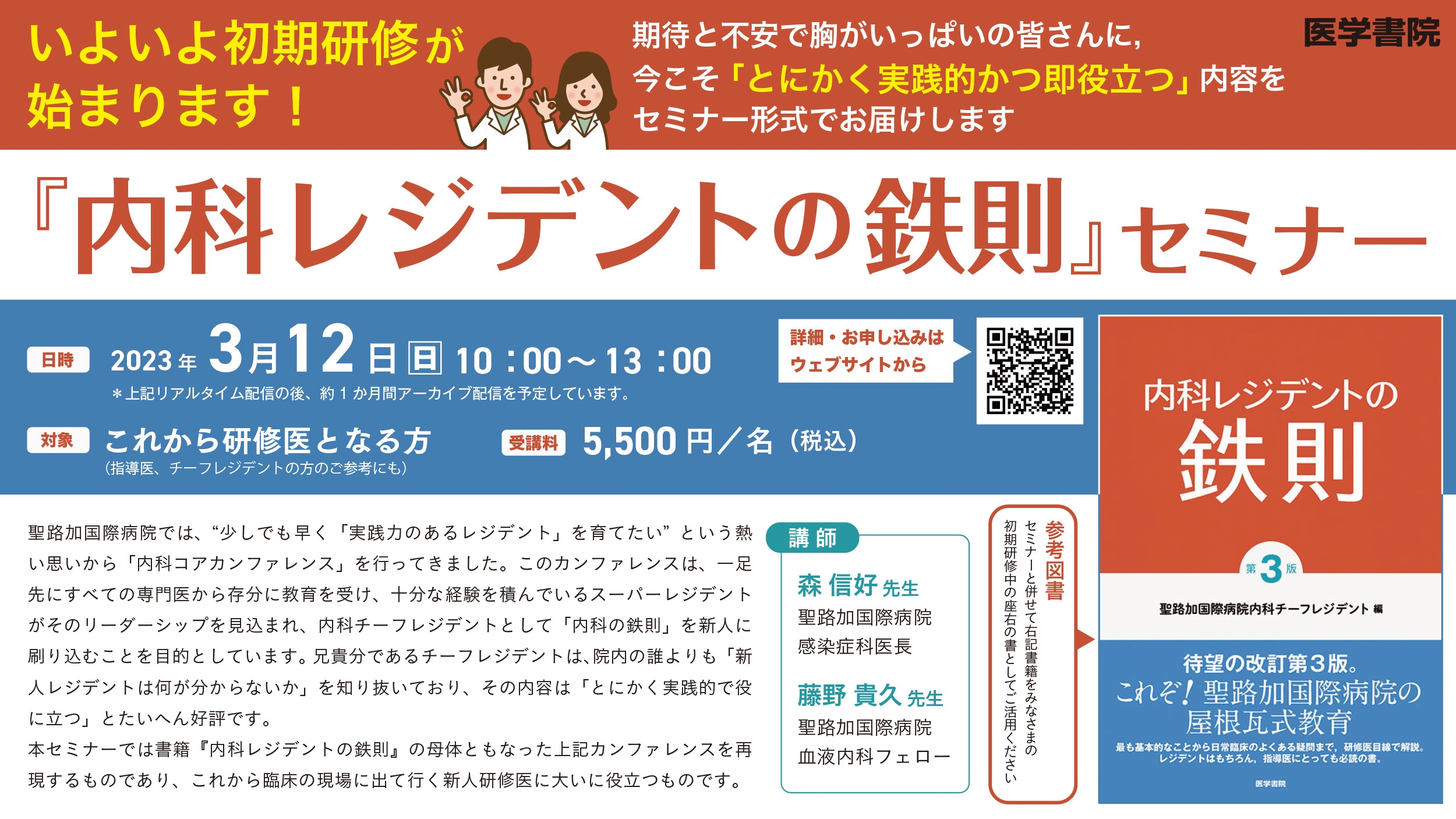 株式会社医学書院(所在地:東京都文京区、代表取締役社長:金原 俊)は、春から研修医となる医学生向けに「『内科レジデントの鉄則』セミナー」(講師:森 信好先生/聖路加国際病院感染症科医長、藤野 貴久先生/聖路加国際病院血液内科フェロー)を2023年3月12日(日)10:00~13:00にオンラインで開催します。