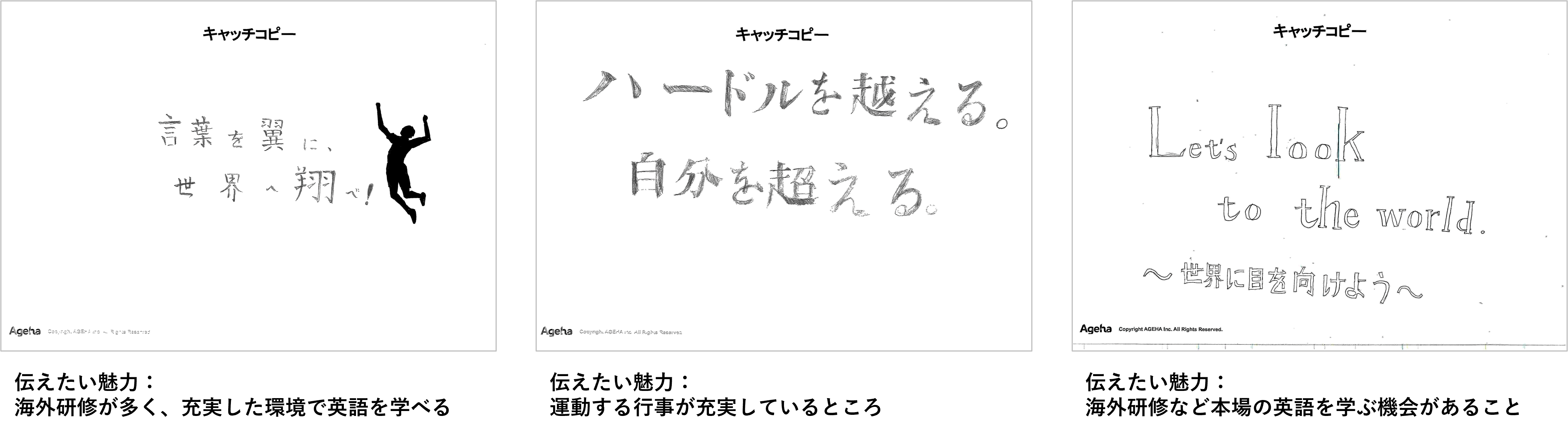 英語教育を魅力に設定した生徒は、英語のコピーをメインにしたり、バレーボール好きのターゲットに合わせて“横断幕”に使われる言葉を用いたキャッチコピーに仕上げたりと工夫を重ねました。また、運動行事の豊富さを魅力とした生徒のキャッチコピーは、ストイックに努力をすることで見える自分の成長を想像させるものとなりました。