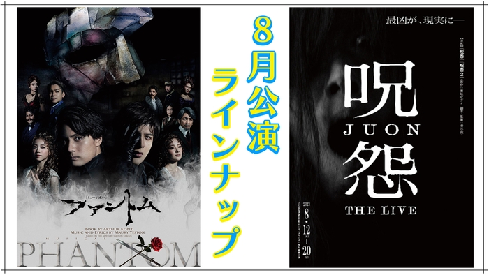 8月には、ジャパニーズホラーの金字塔が体感型ライブエンターテインメントとなった『呪怨 THE LIVE』(新宿)や、俳優の城田優が2019年に続き演出・主演を務めるミュージカル『ファントム』(有楽町)など、関東近郊で開催される多様なジャンルの舞台公演が予定されています。