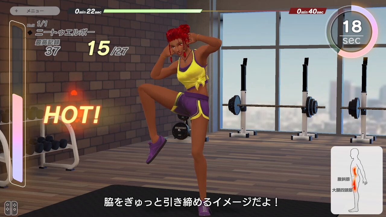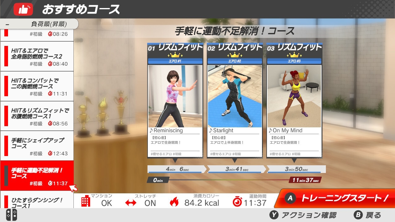 音楽にあわせて体を動かすエアロビクス、ダンス、ボクササイズなどの比較的負荷が軽い有酸素運動のメニュー“リズムフィット”が収録されており、楽しく続けることで基礎代謝アップが期待できます。