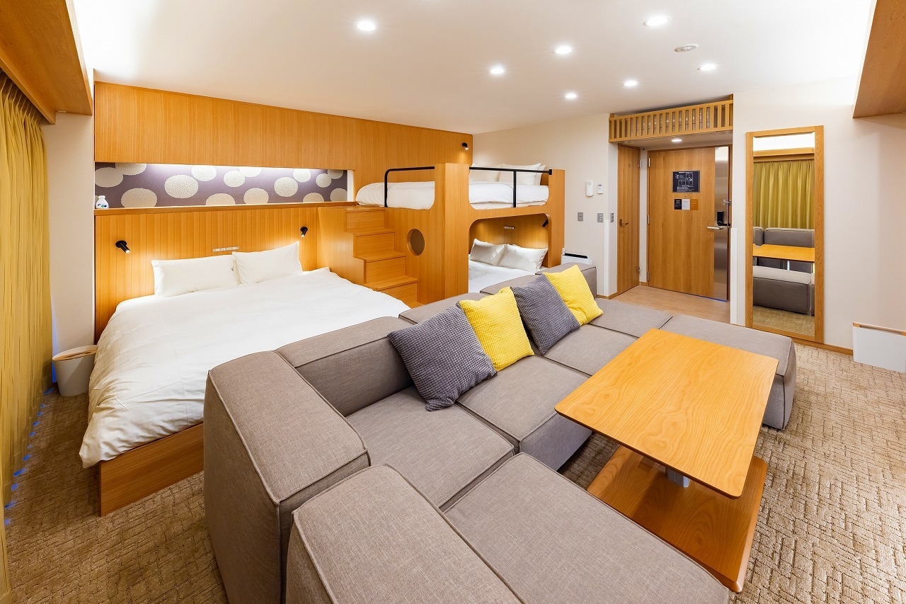 レディースルーム、ファミリールーム、グループルームといったそれぞれのニーズに合わせたルームタイプに、お子様とゆっくり添い寝ができるクィーンベッドから、子供から大人まで楽しめる2段ベッド、高齢者にも安心なリクライニングベッド、小上がりタイプルームといったベッドレイアウトのバリエーションも豊富に揃え、新しいホテルの楽しみ方を提供します。