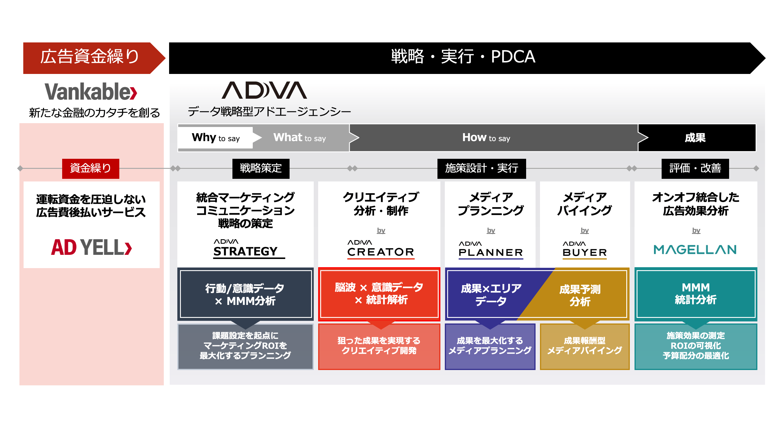 サイカが展開するデータ戦略型アドエージェンシー事業。ADVAは以下4つのソリューションで構成され、マーケティングコミュニケーションの戦略策定から、クリエイティブ制作、メディアプランニング・バイイングに至るまで、従来は感覚的な意思決定が行われることが多かった広告出稿を、データサイエンス技術で定量的な根拠にもとづき行い、ROI最大化を図ることを可能にしました。