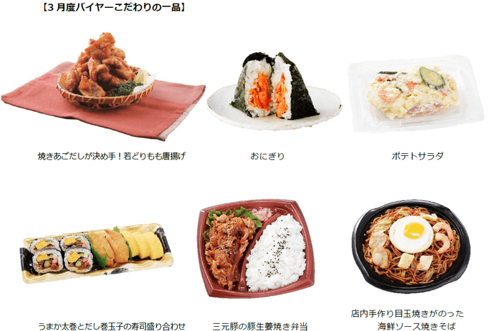 3月にラインアップする商品は、「焼きあごだしが決め手!若どりもも唐揚げ」「おにぎり」「ポテトサラダ」「うまか太巻とだし巻玉子の寿司盛り合わせ」「三元豚の豚生姜焼き弁当」「店内手作り目玉焼きがのった海鮮ソース焼きそば」の6品です。