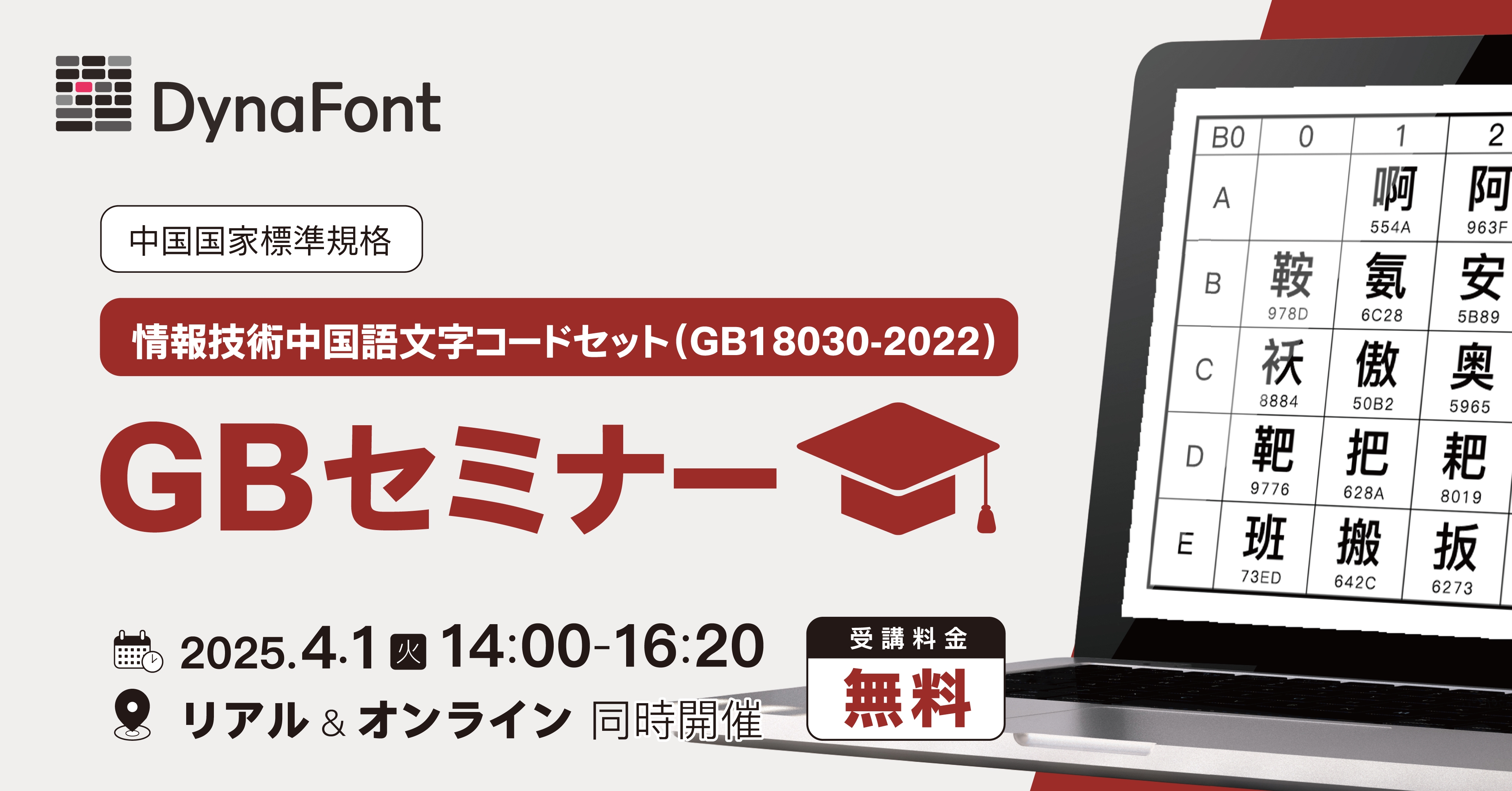 主に文字フォント開発、およびその関連製品の開発・販売・保守を行い、中国国家標準である中国語新文字コード規格「GB18030」に関しまして、日本国内におけるライセンス管理業務を務めるダイナコムウェア株式会社(本社:東京都千代田区、代表取締役:羅 慧美)は、中国(中華人民共和国)の中国電子技術標準化研究院 情報センター 副主任 ヤン・レイ氏および情報センター 中国語研究室 主任 コウ・サンサン氏を特別講師として招聘し、中国国家標準規格「情報技術中国語文字コードセット(GB18030-2022)」についてわかりやすく解説するセミナーを2025年4月1日(火)に開催いたします。