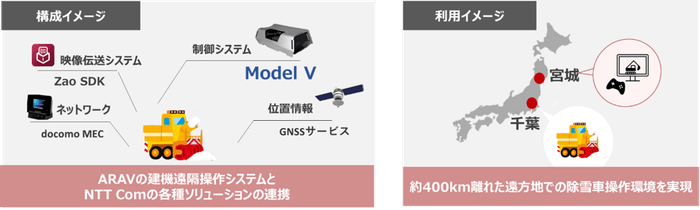 NTTコミュニケーションズ株式会社(以下 NTT Com)とARAV株式会社(以下 ARAV)は、2023年11月22日、千葉県に設置した除雪車を宮城県のコックピットから遠隔操作する実証実験(以下 本実証)を実施しました。建機遠隔操作システムに加えて、高精度な位置情報把握システムや低遅延での映像伝送などを組み合わせた実証を行うことで、除雪車の自動運転実現をめざします。