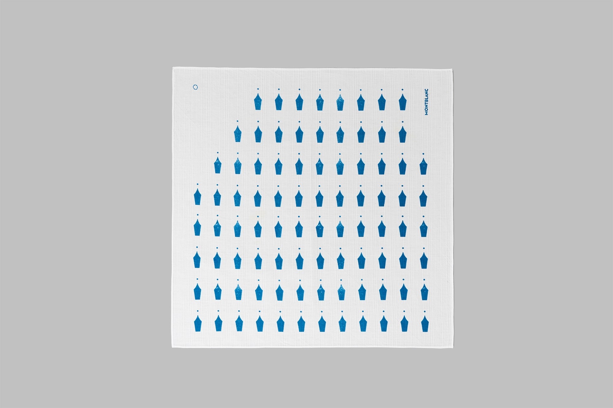 筆記文化の雄であるモンブランのブランドアイデンティティを、日本ならではの知恵の結晶である万能のラッピングクロスである「ふろしき」で表現しました。日本人のおもてなしの心と物を大切にする文化として伝承されていた、再利用ができる「ふろしき」に着目し、モンブランDNAであるインクブルーとペン先がデザインされたパターンとコラボしました。潔い白地に京型友禅染のインクブルーで染め抜かれた万年筆ペン先を、末広がりを表現する日本のラッキーナンバーに由来する88個並べたデザインとなっています。