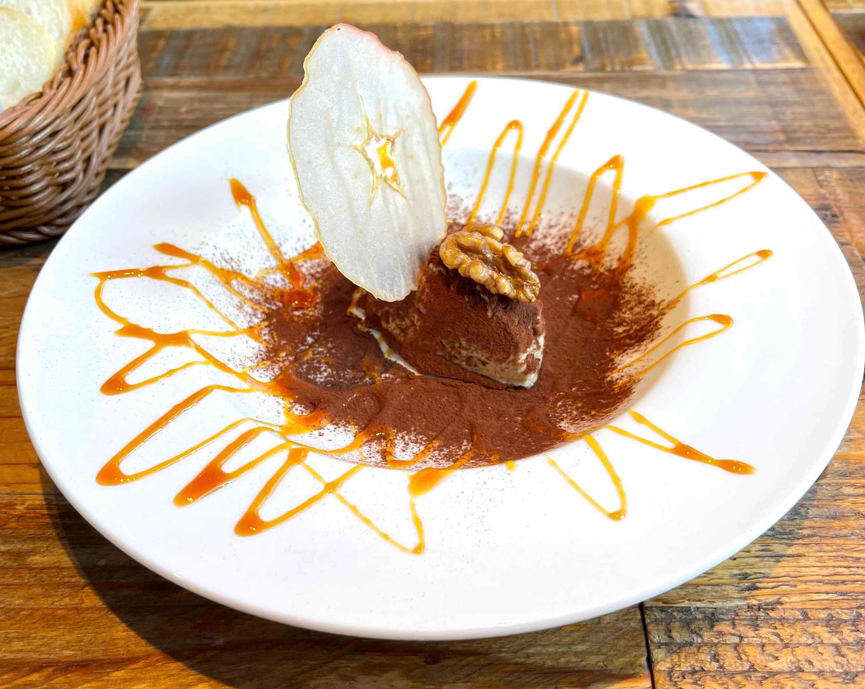 ▲レバーなのに冷たい!? 「冷製ラムレバーのクリーム仕立てキャラメルソース 林檎のチップス添え」