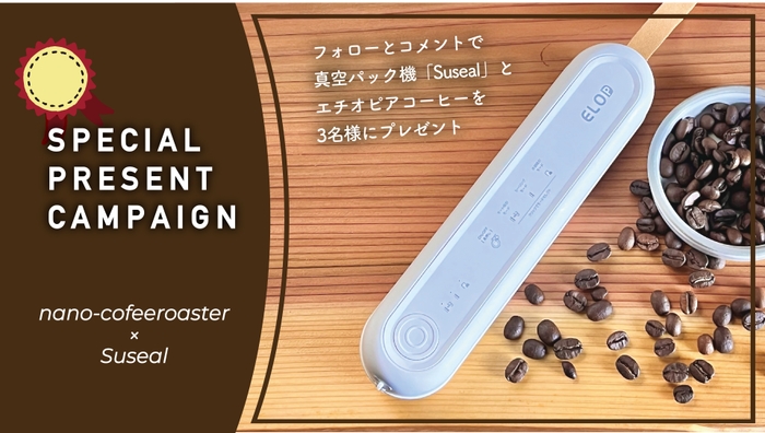 本キャンペーンでは真空パック機「Suseal」と、浅草橋に2024年12月にオープンしたエチオピアコーヒー専門店「nano-coffeeroaster」(東京都台東区浅草橋1丁目17−4)で焙煎されたエチオピア産のコーヒー粉をセットにして3名様にプレゼントをいたします。