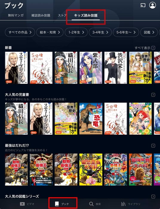 アプリでは「ブックタブ」内に、Webではメニューバーに「キッズ読み放題」が表示され、月額会員の方であれば対象作品が追加料金不要でお楽しみいただけます。