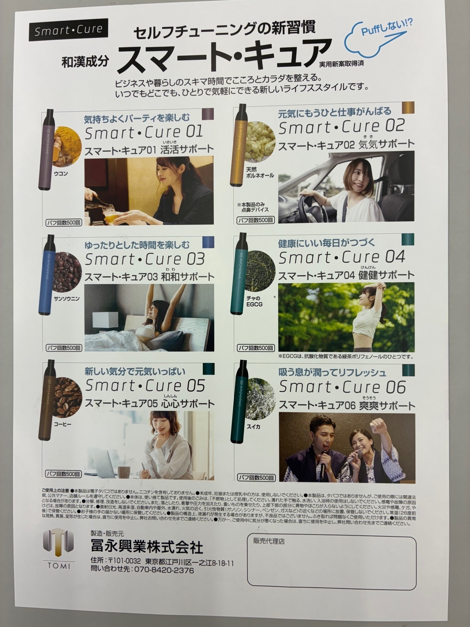 医療機器販売を行う冨永興業株式会社(所在地:東京都江戸川区、代表取締役:冨永 健司)は、電子タバコではなく、ニコチンフリーの機能性フレーバーデバイス和漢成分「スマート・キュア」6種商品を応援購入サイト「Makuake」にて2025年7月7日(月)まで先行予約販売を行っています。