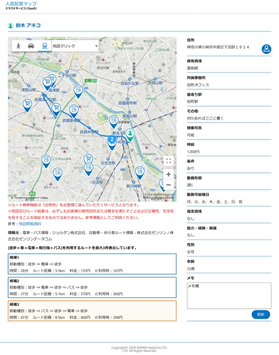 ゼンリンデータコムが提供する「人員配置マップ」に、 ジョルダンが保有する「乗換案内Biz API」を活用した [ドアtoドア検索]機能を追加