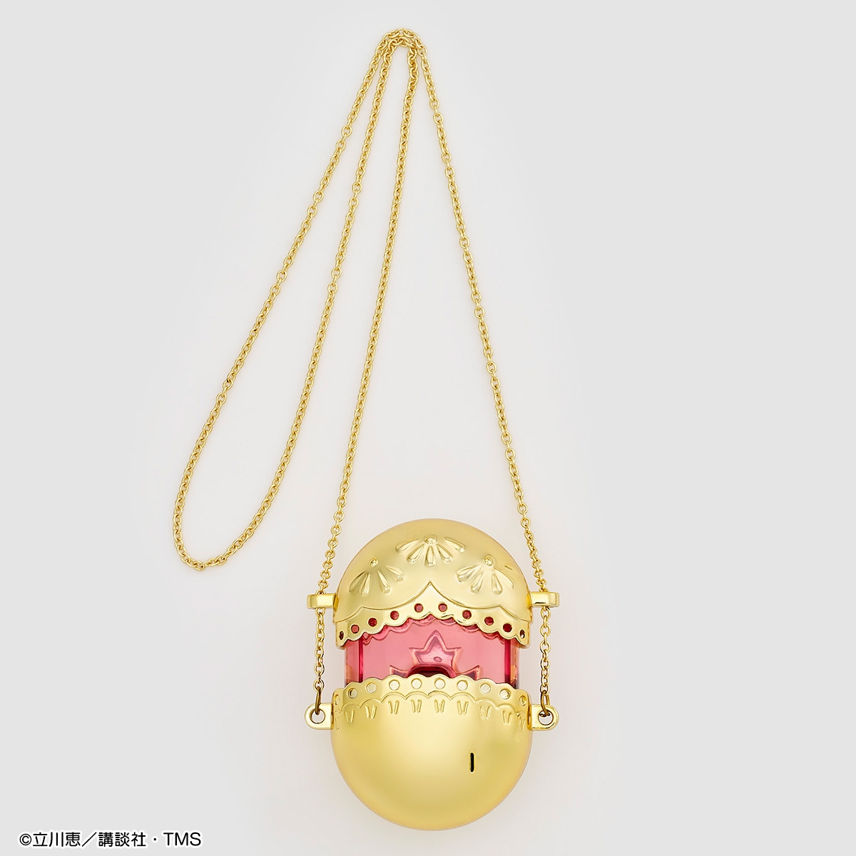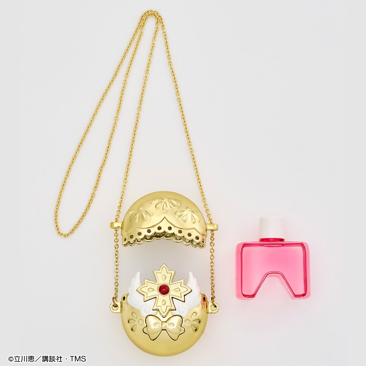 また、ゴールドカラーのチェーンが付属しており首からぶらさげることが可能で、クリア部分の容器には、ローズの香りがするコロンが入っております。これらの仕様は発売当時の玩具を再現しております。