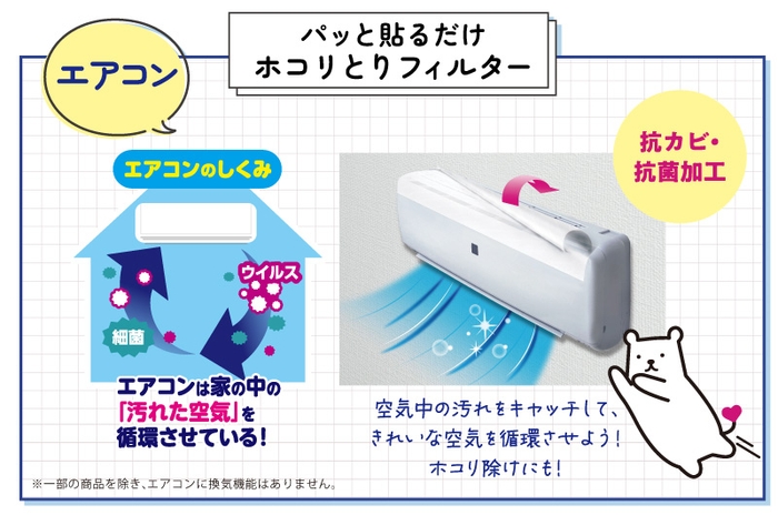 空調機器などの家電や排気口に使えるフィルターも続々増えているので、汚れが気になるところにパッと貼って簡単掃除♪