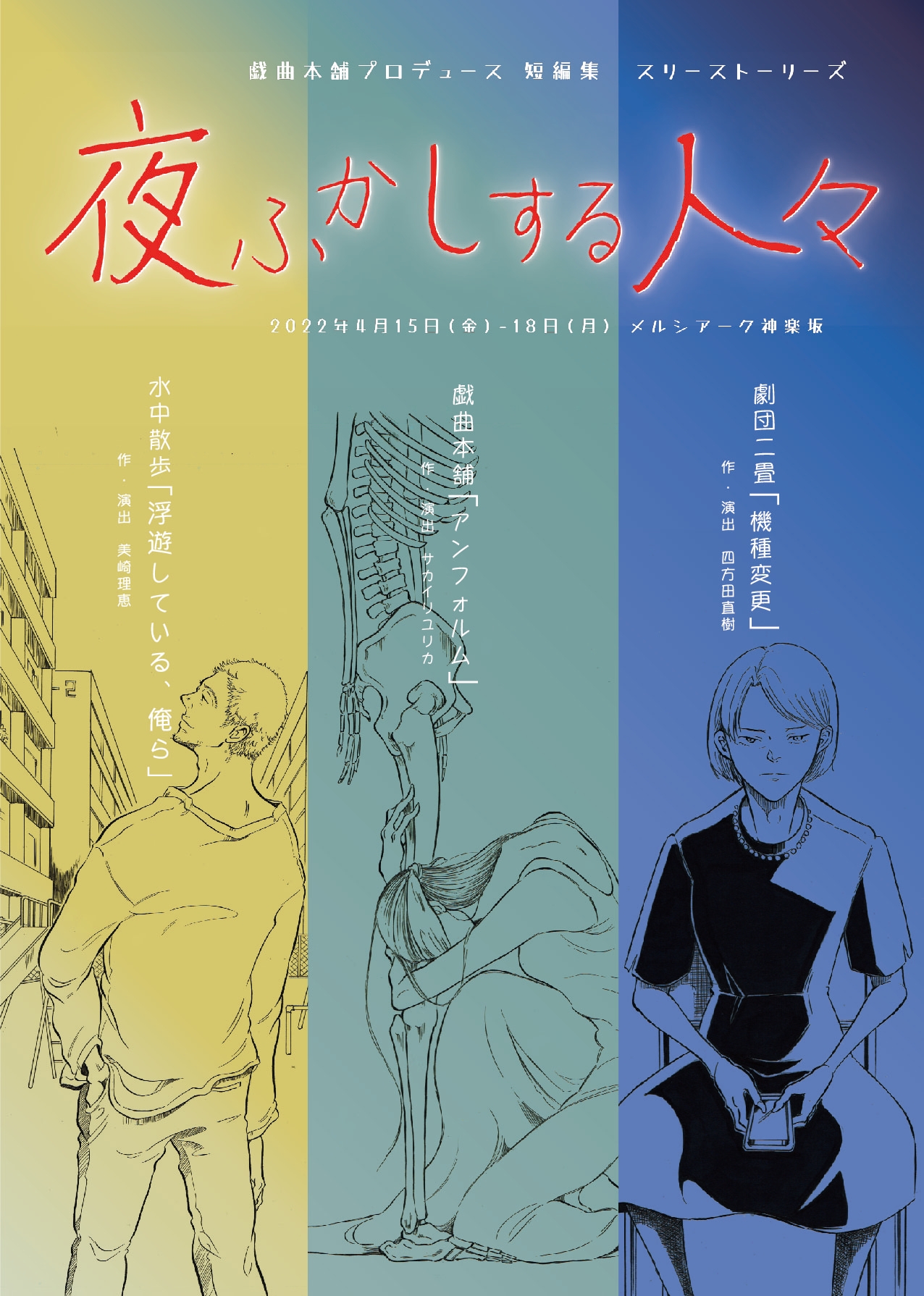 「夜ふかしする人々」を共通モチーフに描く、3つの短編作品(30分以内)のオムニバス公演。