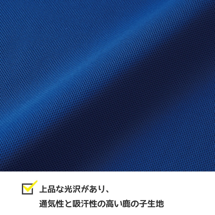 ポリエステル100%の鹿の子編み生地を採用。通気性と吸湿速乾性に優れ、汗をかいてもサラッと快適な状態をキープします。