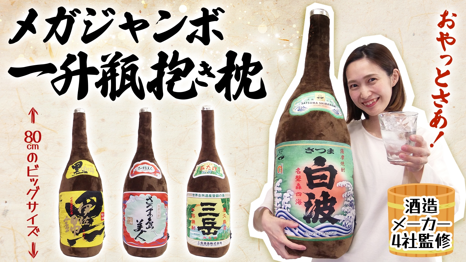 黒伊佐錦(大口酒造株式会社)、さつま島美人(長島研醸有限会社)、さつま白波(薩摩酒造株式会社)、三岳(三岳酒造株式会社)(※各銘柄の五十音順)を忠実に再現した、全長80cmの一升瓶抱き枕です。