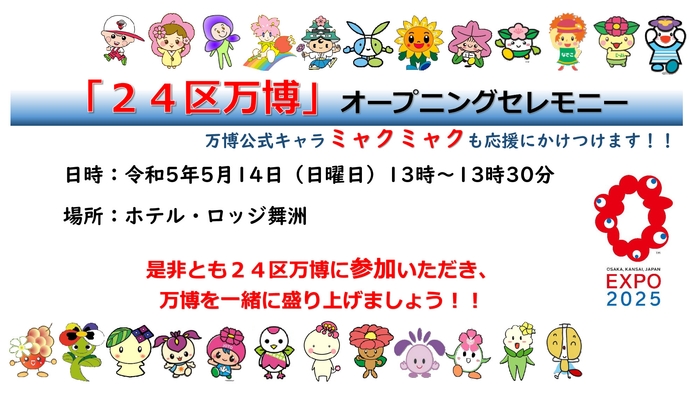 2025年の大阪・関西万博に向け、開催700日前の本年5月14日(日)、大阪ベイエリアにある都市型リゾート施設「ホテル・ロッジ舞洲(以下、ロッジ舞洲)」(所在地:大阪市此花区北港緑地2-3-75)で、万博成功を祈念するイベント「24区万博」が開催されます。大阪市の主催で、全24区役所のマスコットキャラクターが勢ぞろいするとともに、横山大阪市長と万博公式キャラクターの「ミャクミャク」が応援に駆け付けます。