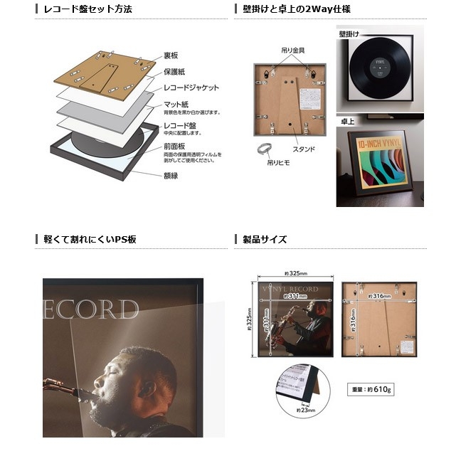 付属の背景マット紙を使用して、レコード盤をそのまま飾ったり、10インチレコードジャケットを飾ることも可能。壁掛けはもちろん、デスクなどにも飾れるスタンド付きです。