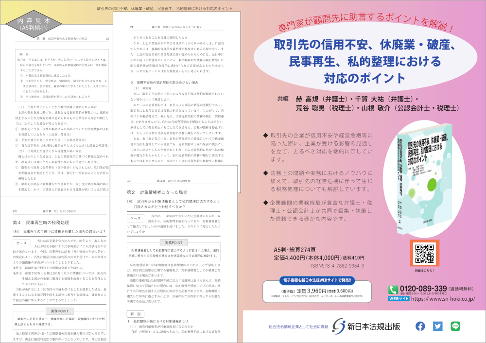 新日本法規出版株式会社(所在地:愛知県名古屋市中区栄1丁目23番20号、代表取締役社長:河合誠一郎(https://www.sn-hoki.co.jp/))は、「取引先の信用不安、休廃業・破産、民事再生、私的整理における対応のポイント」を2024年6月24日に発売いたしました!