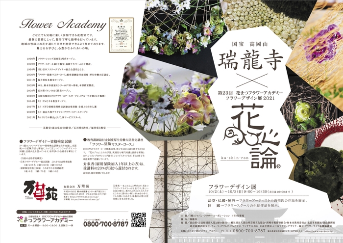 株式会社ジャパン・フラワー・コーポレーション(本社:富山県射水市、代表取締役社長:松村吉章)が運営する「花まつフラワーアカデミー」では、第23回花まつフラワーデザイン展『花心論2021』を、国宝 高岡山 瑞龍寺にて開催しました。『花心論』は、花まつフラワーアカデミースクールの生徒様の、日ごろの研鑽の発表の場であり、またフラワーアートのトップランナーを招いて、花から始まる豊かなライフスタイルを表現し、お伝えするべく1999年の初回より継続して開催しているお花の一大イベントです。生徒様からの数多くの作品も華やかに展示され、各方面からの受賞も発表されました。