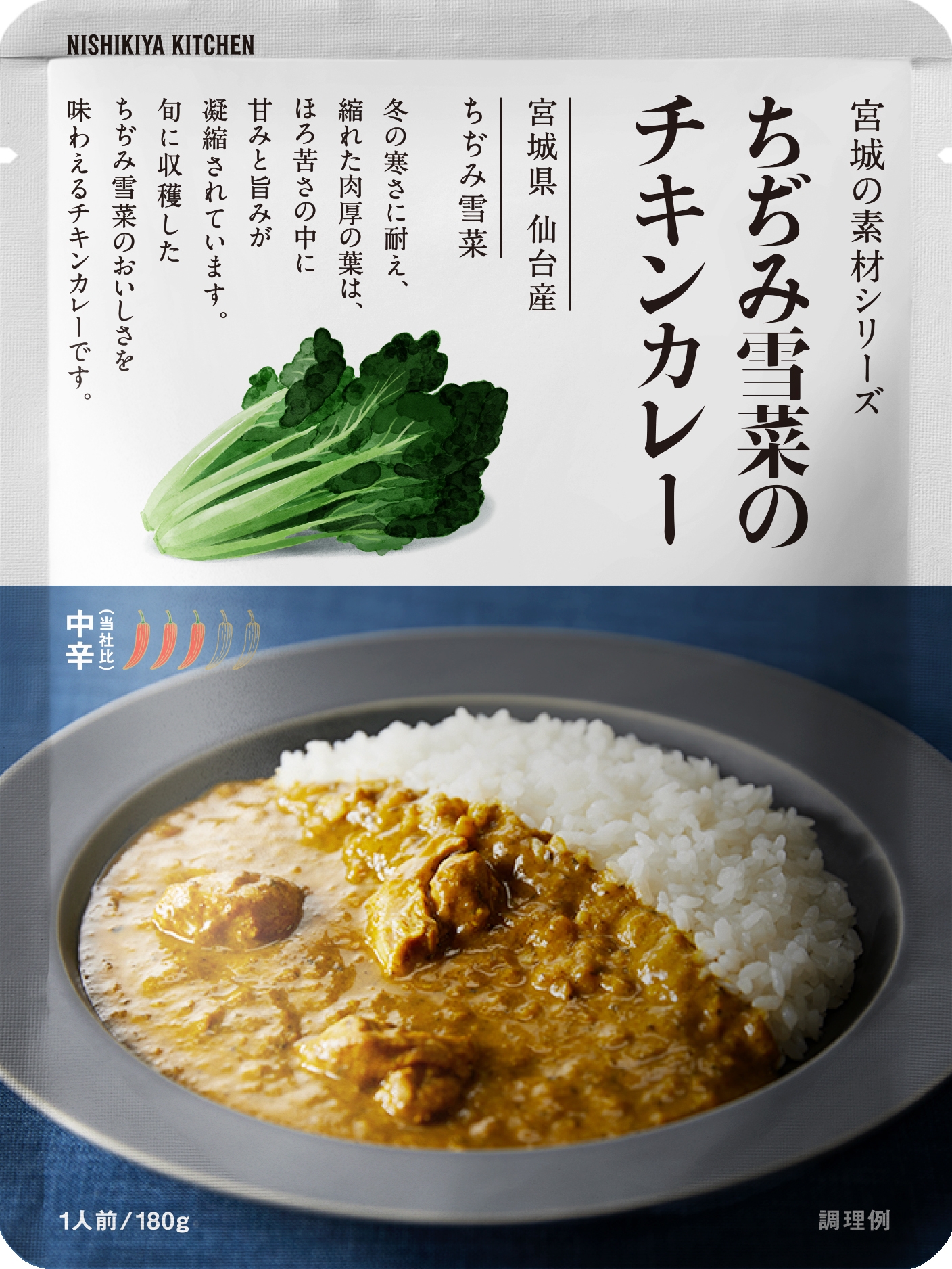 宮城県仙台市で丁寧に育てられたちぢみ雪菜を使用したチキンカレーです。一番おいしい時期に収穫したちぢみ雪菜のほろ苦さを生かした味わいに仕上げました。2021年4月から毎年、数量限定で発売しており、累計で1万食を売り上げています。【内容量180g 価格520円(税込)】