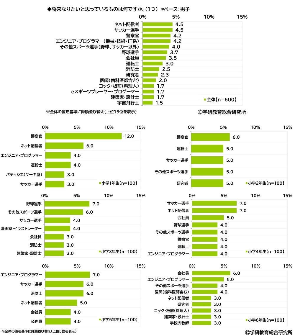 学年別にみると、1年生と2年生では「警察官」、3年生では「野球選手」、4年生では「サッカー選手」「ネット配信者」、5年生では「エンジニア・プログラマー」、6年生では「会社員」が1位でした。