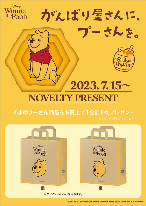 また7月15日(土)~「がんばり屋さんに、プーさんを。」キャンペーンも開催します。「くまのプーさん」商品をお買い上げのお客様1会計につき、1枚ショッピングバッグをプレゼント。