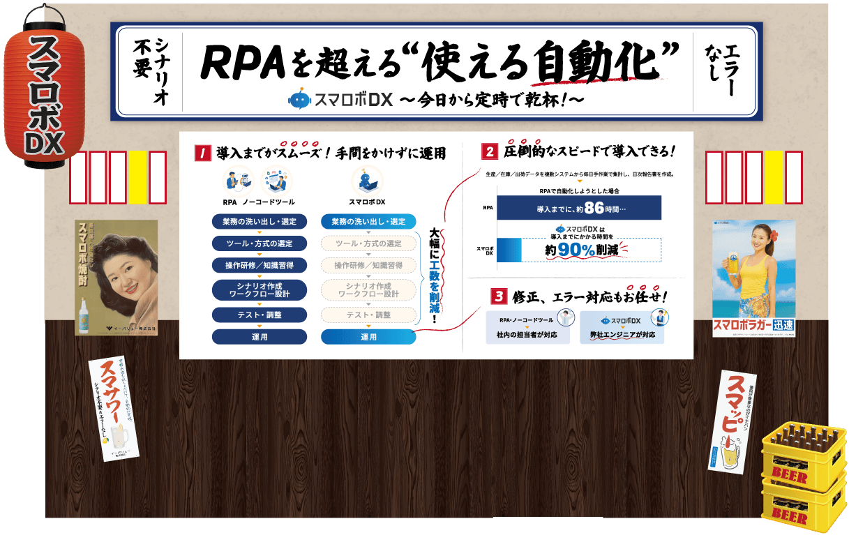 「作業時間を最大93%削減」「年間270万円の人件費カット」「知識ゼロで導入できたことに感動」など、効果を“壁面メニュー”風に提示。スマロボDXが叶える業務改善を分かりやすく伝えています。