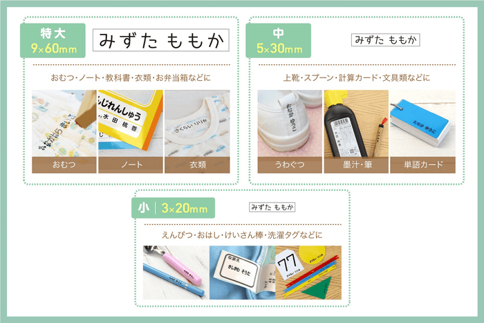 オムツに押すことができる特大サイズの入った3本セットです。学校でつかうノートにも特大サイズがピッタリです。その他、お弁当箱、鉛筆などの文具から衣類、上靴、体操服や赤白帽など、さまざまな持ち物への名前つけにお使いいただけます。