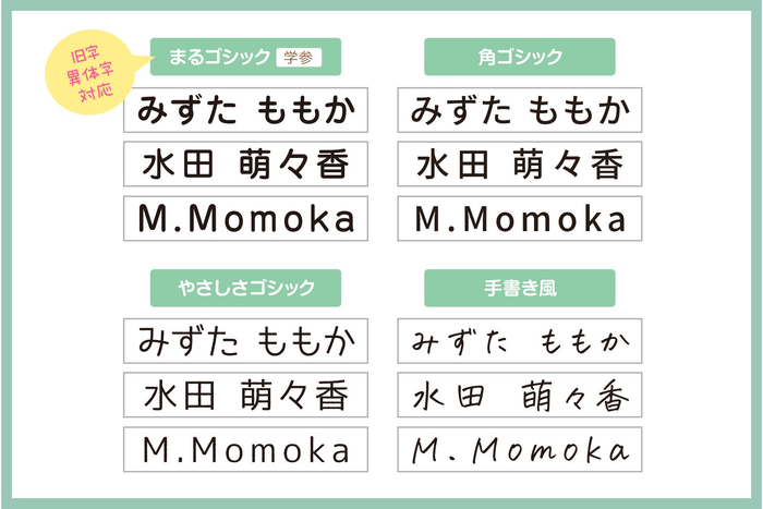 学参・旧字に対応した「まるゴシック」からかわいい「手書き風」まで、全4種類のフォントから選ぶことができます。大人でも使いやすいようにと新しい「手書き風」フォントを今回はじめて採用。お子さまが、高校生、大学生になってもシールDEネームの商品をご愛用いただければというキモチを込めています。