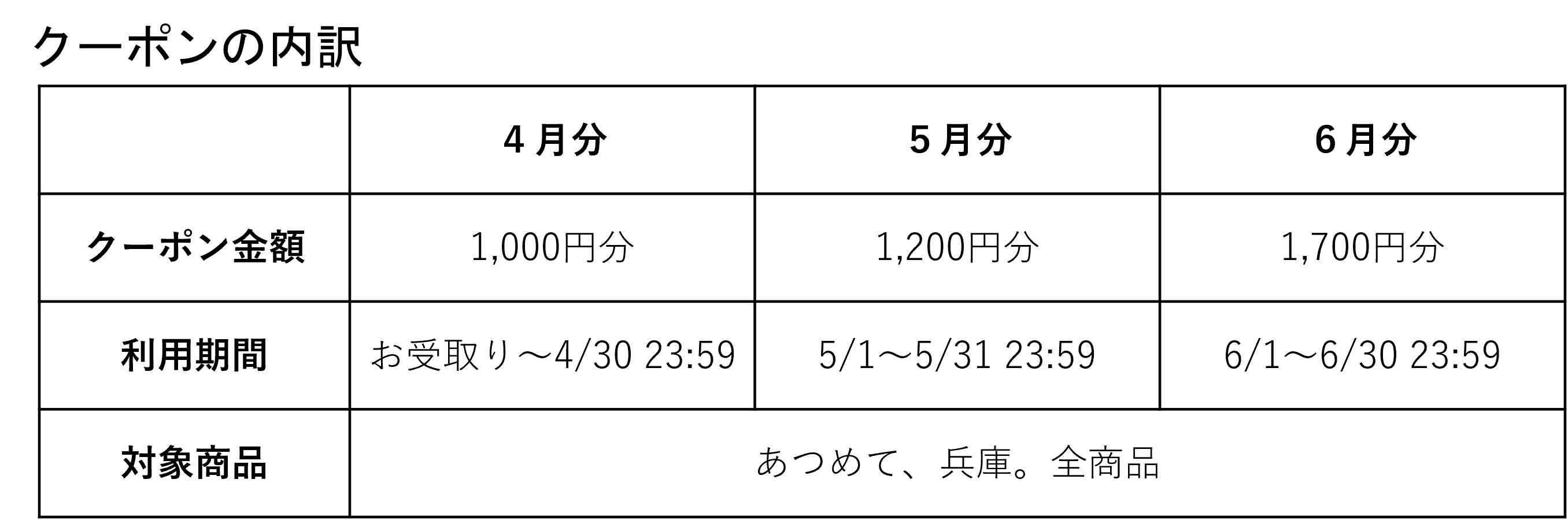 合計3,900円分のクーポンは利用対象月ごとにクーポン金額がステップアップし、4月利用可能クーポンは1,000円分、5月利用可能クーポンは1,200円分、6月利用可能クーポンは1,700円分と大変お得な内容となっております。ぜひこの機会に、当ショップでのお買い物をお楽しみください。あつめて、兵庫。 ショップTOP