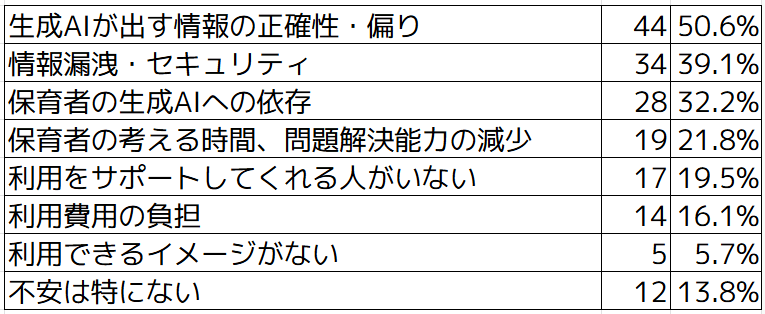 生成AIを利用している方がもっとも不安に感じているのは「生成AIが出す情報の正確性・偏り」で50.6%という結果でした。次いで「情報漏洩・セキュリティ」が39.1%、「保育者の生成AIへの依存」が32.2%があげられました。