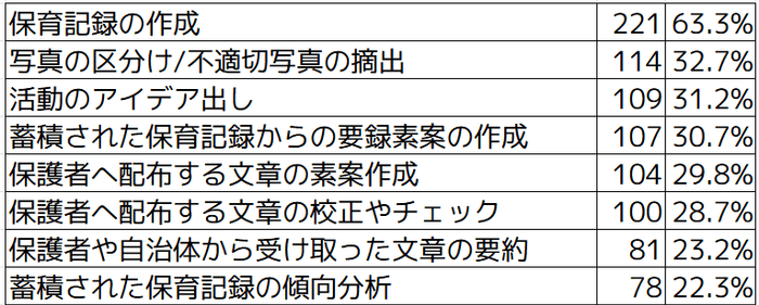 「保育記録の作成」が63.3%ともっとも多く、次いで「写真の区分け/不適切写真の摘出」が32.7%という結果となりました。その他としては「抵抗はないがイメージがわかない」や「指導案や保育計画の作成」などがあげられました。