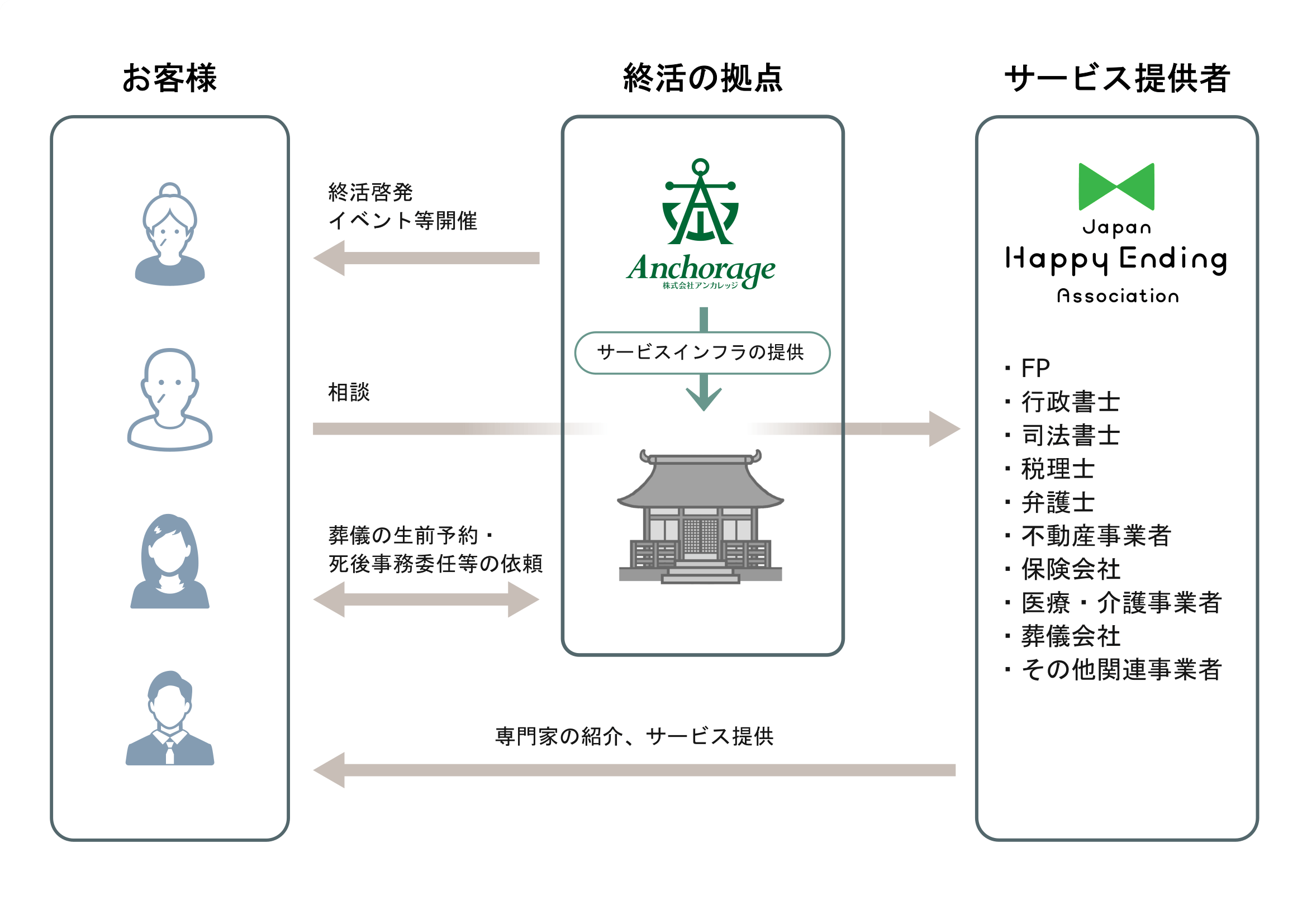 日本Happy Ending 協会は、各士業をはじめ、ファイナンシャルプランナー、医療や葬祭関連企業に至るまで幅広い事業者との連携に取り組んでおり、超高齢化社会に伴う広範な問題の包括的サポート体制を整えています。アンカレッジ、寺院、そして日本Happy Ending協会の連携により、寺院を拠点とした終活に関するワンストップサービスの提供が可能となりました。