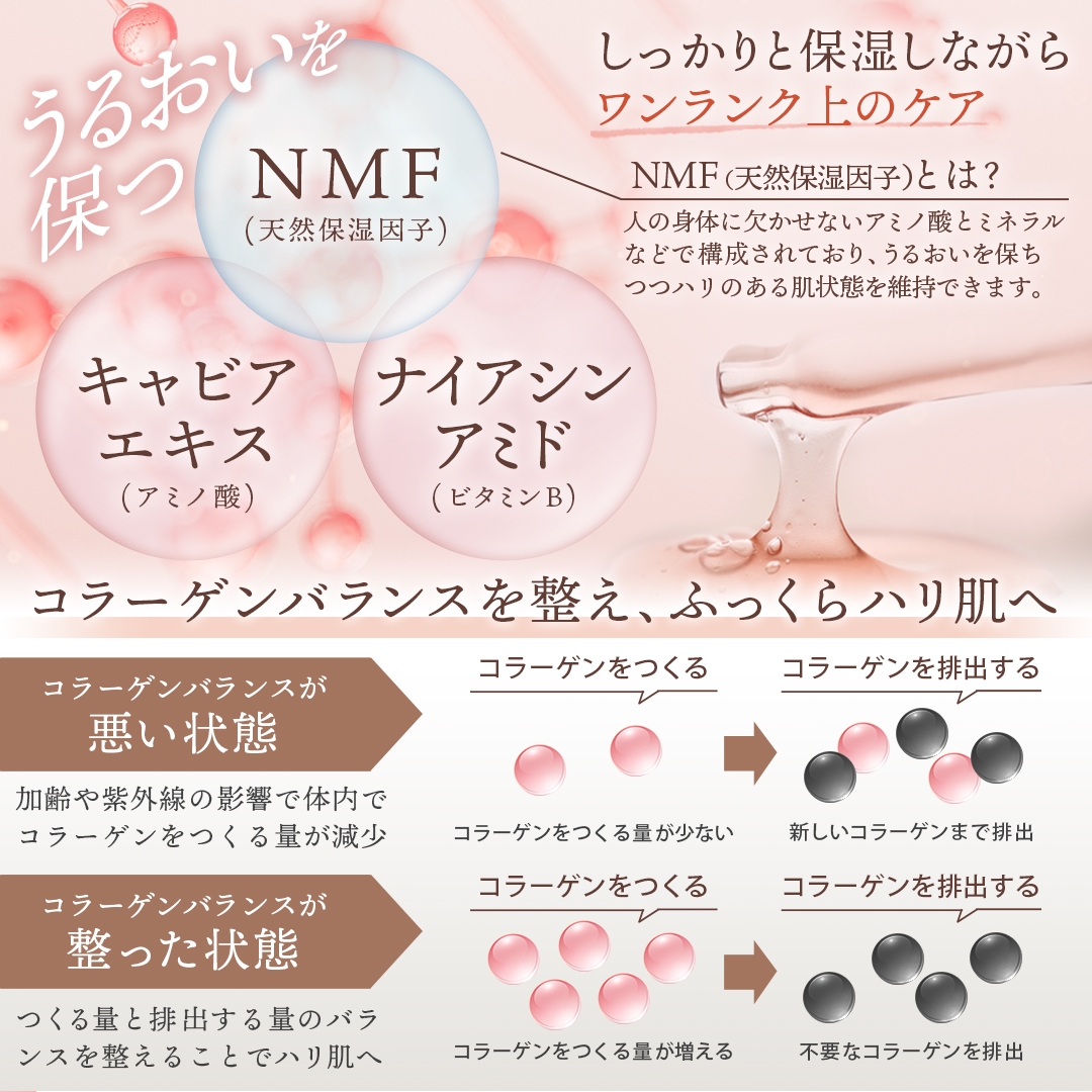肌に元々備わっているNMFを効率よく補うアミノ酸を多く含んでいるキャビアエキスとナイアシンアミドの効果でお肌の保湿だけでなく、バリア機能も強化。