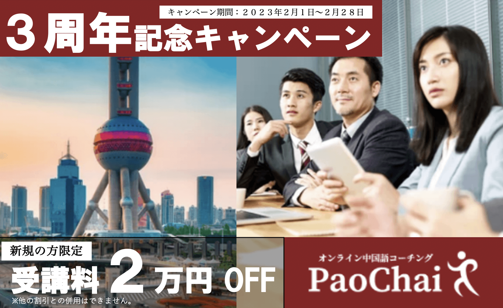 中国語コーチング(PaoChai)をオンライン完結で展開する株式会社Rungar(本社:東京都新宿区西新宿、代表取締役:冨江 恭直)は、2023年2月1日(水)~2月28日(火)に、PaoChaiオンライン中国語コーチングのサービス開始3周年を記念し、期間中に新規お申し込み頂いた方を対象に受講料が2万円オフとなる「3周年記念キャンペーン」を実施いたします。