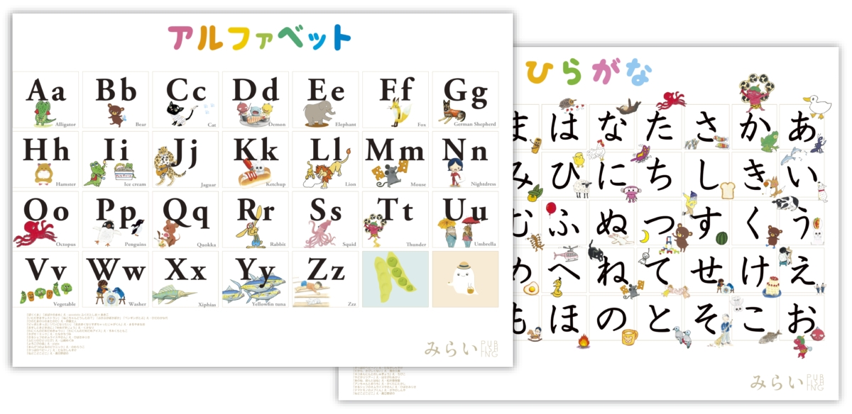 絵本のキャラクター入り アルファベット表 & ひらがな表(A3サイズ・各1枚)