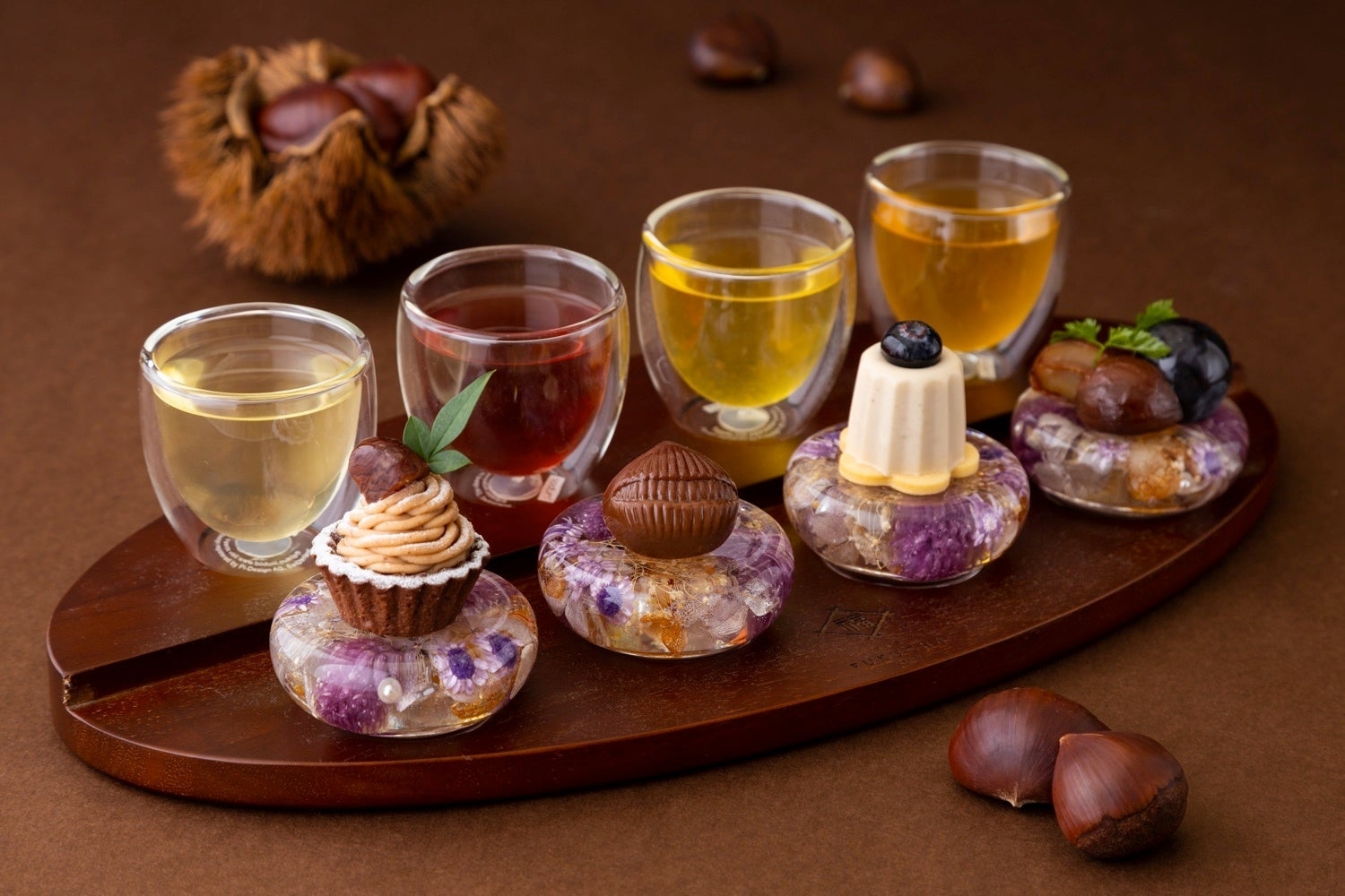 FUKUCHAで人気の宇治茶ハーブティーのペアリングセットの秋冬限定メニューです。それぞれの宇治茶にハーブを掛け合わせ栗スイーツをペアリングしました。シェフ手作りのハーバリウムディッシュで目にも艶やかにお召し上がりいただけます。
