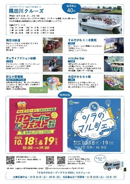 10月18日(土)・19日(日)は荒川区のあらかわ遊園前・宮前公園前で、続いて翌週10月25日(土)・26日(日)には江東区越中島の「隅田川テラス」が舞台となります。