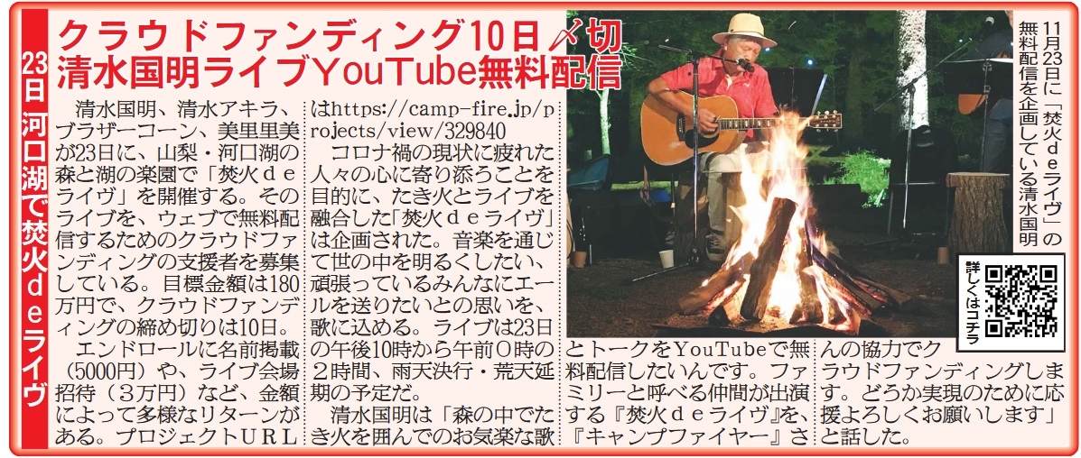 株式会社kuniaki.plusは、清水国明・清水アキラ・ブラザーコーン出演「焚火deライヴ」の無料配信のため、2020年11月10日(火)までの期間でクラウドファンディングに挑戦中!の記事が日刊スポーツで掲載されました。