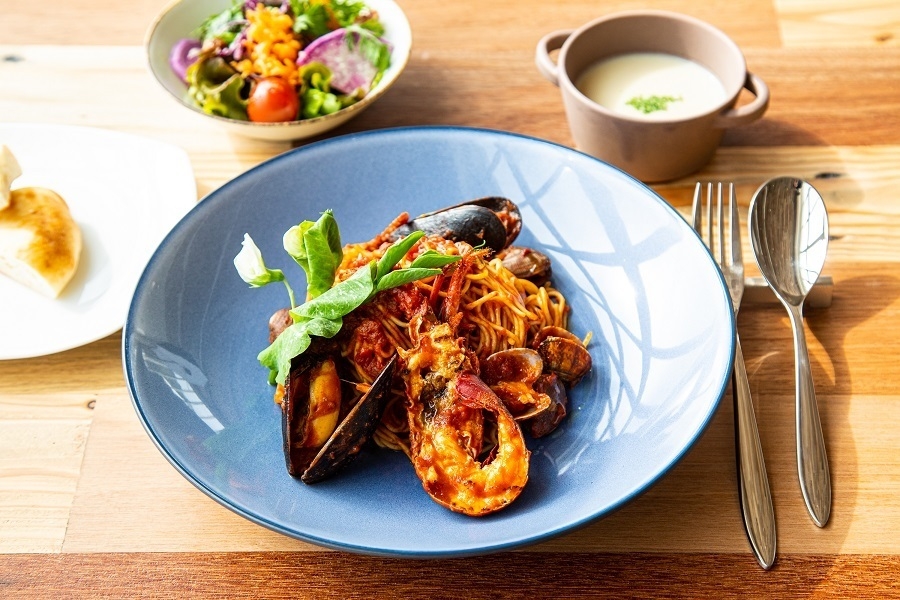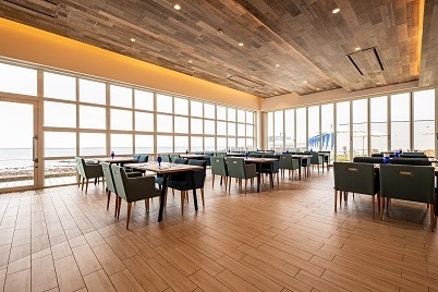 敷地内センター棟のカフェレストラン「LA MER BLEUE」があります。料理は、地元産のブランド魚をはじめ、地産地消の食材をふんだんに使用したメニューをご堪能いただけます。また、当施設が賛同するSDGsの観点から、カフェや客室のテーブルは、すべて廃材を再利用したものを採用しています。