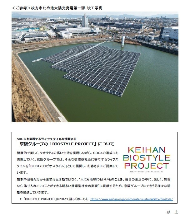 京阪ホールディングス株式会社(本社:大阪市中央区、社長:平川良浩、以下「当社」)は、水上ソーラー合同会社(代表企業:株式会社環境資源開発コンサルタント、本社:大阪市城東区、社長:金城義栄、以下「水上ソーラー」)および関西電力株式会社(本社:大阪市北区、ソリューション本部長:藤野研一、以下「関西電力」)と、コーポレートPPA契約※1を締結し、12月上旬に枚方市内のため池においてフロート型太陽光発電設備の設置工事に着手します。